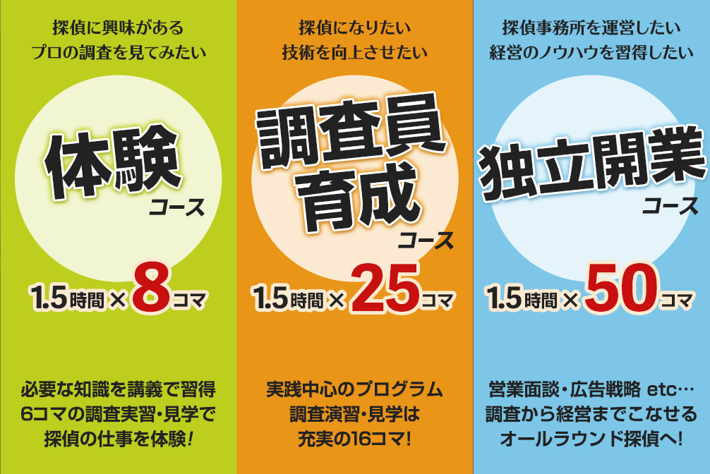 探偵事務所の開業を目指すためのコースです。調査員としてのスキルが身につくだけでなく、経営者としてのノウハウが学べるカリキュラムです。法律の知識や依頼者との面談の仕方、広告戦略といった探偵業の経営に欠かせない知識を習得することができます。独立後は、開業地域によっては業務提携も可能です。卒業後のフォロー・アドバイスまで万全のコースとなっています。