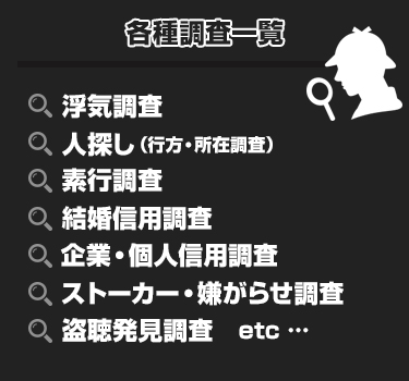 業界屈指の高い調査力により「真実の証拠」を成功率99.8%で掴み、多くのお客様のお悩みを解決しています。他の調査会社で失敗した方や調査をお断りされた方からのご依頼が多いのも特徴で、2017年1月現在、解決実績は34,713件を突破しております。
